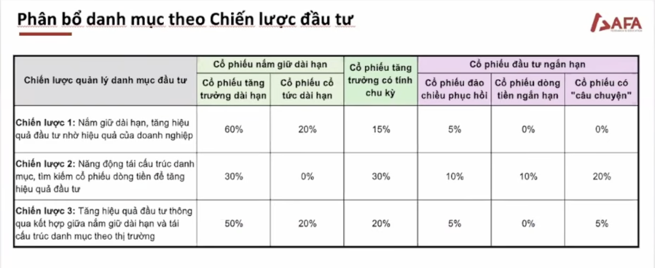 Thị trường luôn đúng, dù nó tăng hay giảm. Quan trọng là chúng ta có kịch bản đầu tư (“Tốt/ Trung bình/ Xấu” tương ứng với “Đèn xanh - Đèn vàng - Đèn đỏ”), với mỗi tình huống, ta sẽ cấu trúc danh mục ntn.