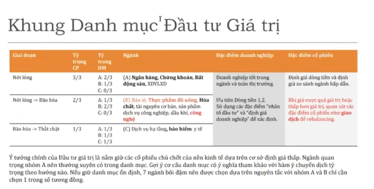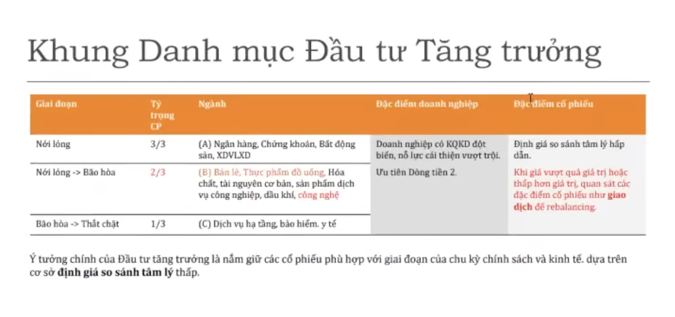 4 ngành bền vững lâu dài: Công nghệ - Tài chính - Bán lẻ - Đất. Các ngành mang tính thời vụ: Thép - Hóa chất - Vận tải - …