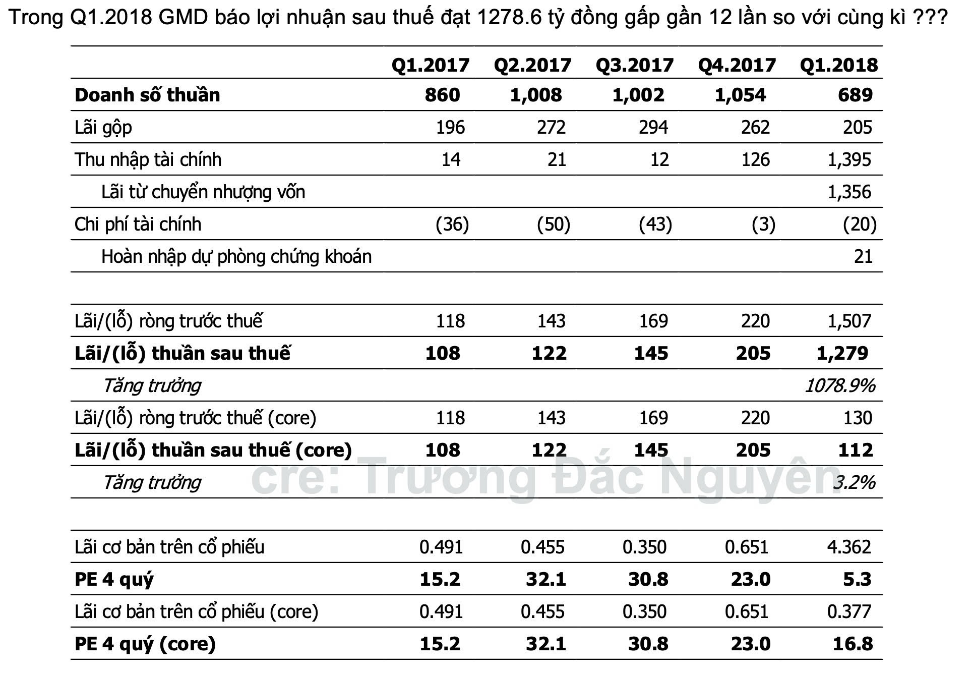 GMD Năm 2018, GMD báo lãi gần 1300 tỷ nhờ bán tài sản cảm nhận định giá rất rẻ nhưng thực tế đó là 1 giai đoạn kinh doanh kém của GMD và nhà đầu tư không chú ý sẽ gặp cổ phiếu mất 1/3 giá trị trong 1 năm sau đó.