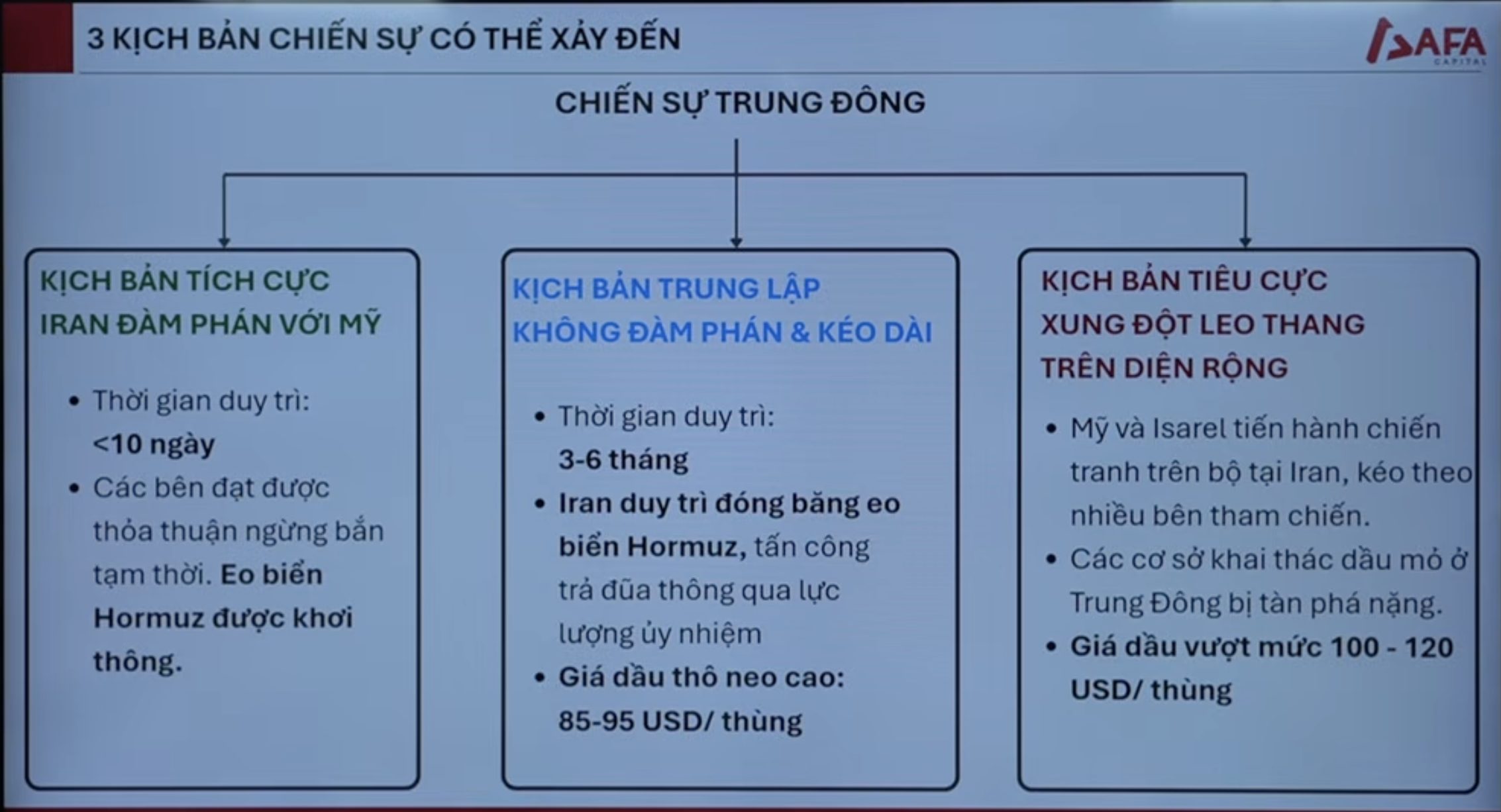 - Trung lập: Giao tranh kéo dài - Giá dầu thô ở mức 85-95 đô/thùng ⇒ Cấu trúc lại danh mục, bỏ các cp beta cao, biến động theo thị trường. Bổ sung các nhóm ngành hưởng lợi trực tiếp từ xu hướng tăng giá vàng và dầu mỏ