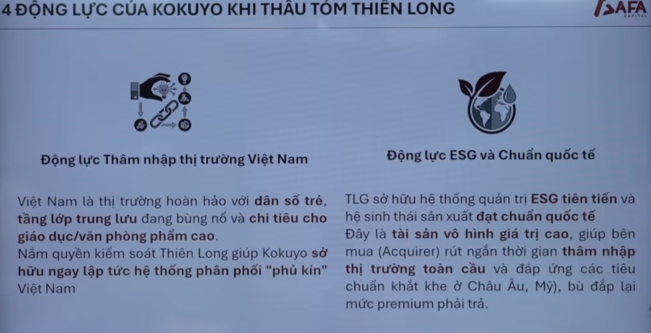 - Trong vụ Tập đoàn KOKUYO mua Thiên Long (TLG), họ sẽ chia làm 2 bước: Mua tập đoàn Thiên Long An thịnh (46,82%), và bước 2 là chào mua công khai khoảng 18.19%. Tổng số này ? 65% ⇒ Họ sẽ có thể có toàn quyền quyết định với TLG